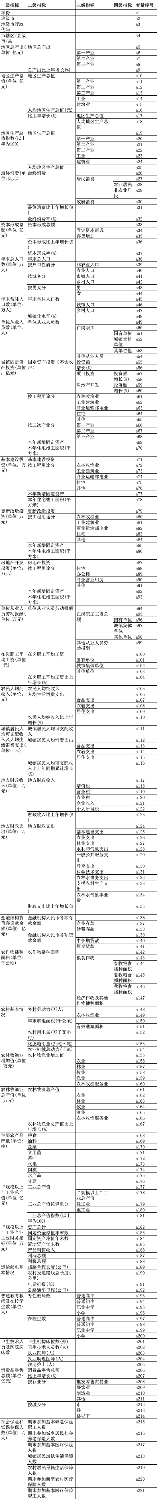 2.数据库变量情况:本数据库包括了福建统计年鉴(2000-2017年)中所有的数据项目,共计221个变量,详细情况如下: