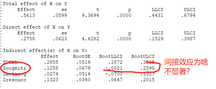为什么process结果里中介的两条路径都显著,最后总的间接效应不显著?