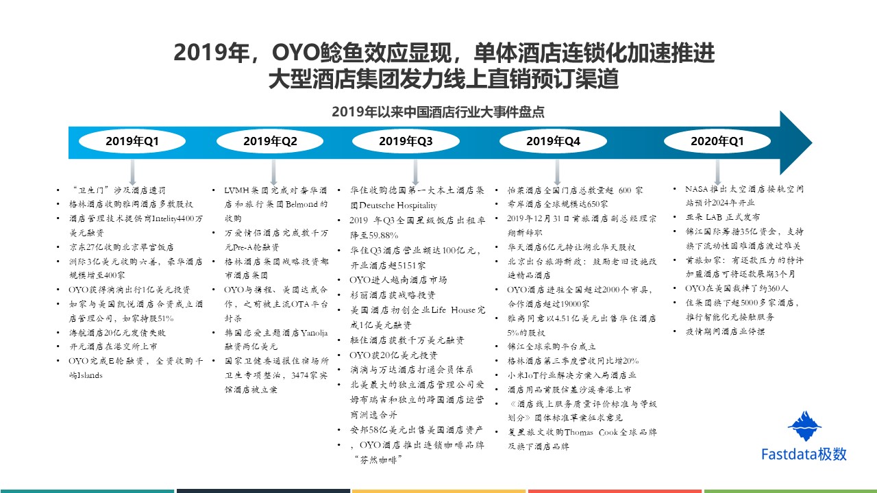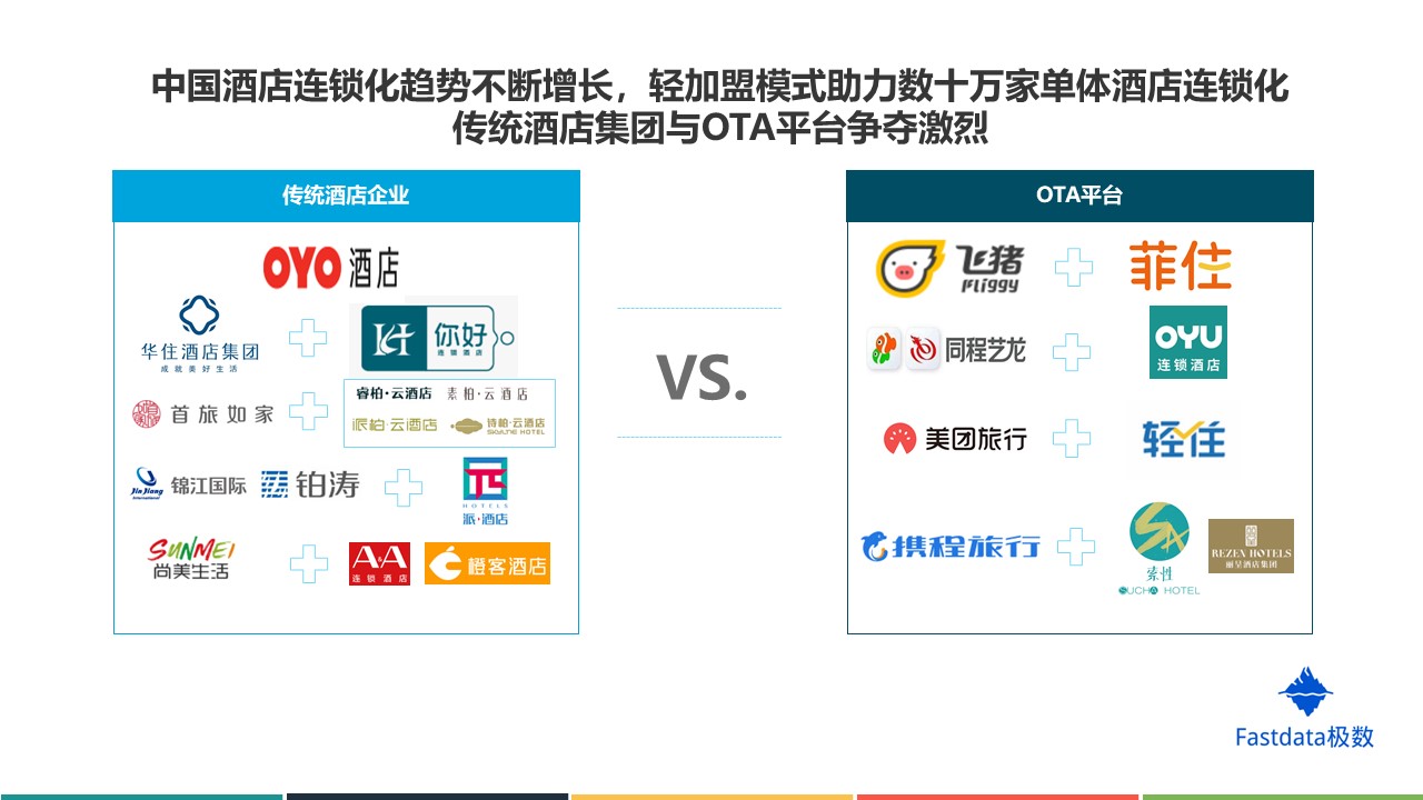 单体酒店连锁化加速:OYO横空出世,鲶鱼效应显现,2019年以来中国单体酒店连锁化趋势加速推进,传统酒店集团锦江国际、华住、首旅如家等为应对OYO带来的挑战,大力推进轻加盟,快速扩张门店数量。此外,单体酒店快速连锁化给OTA平台的分销定价权构成了挑战,OTA平台也在快速布局上游酒店联盟,如同程艺龙OYU、飞猪菲住联盟、美团酒旅轻住等。