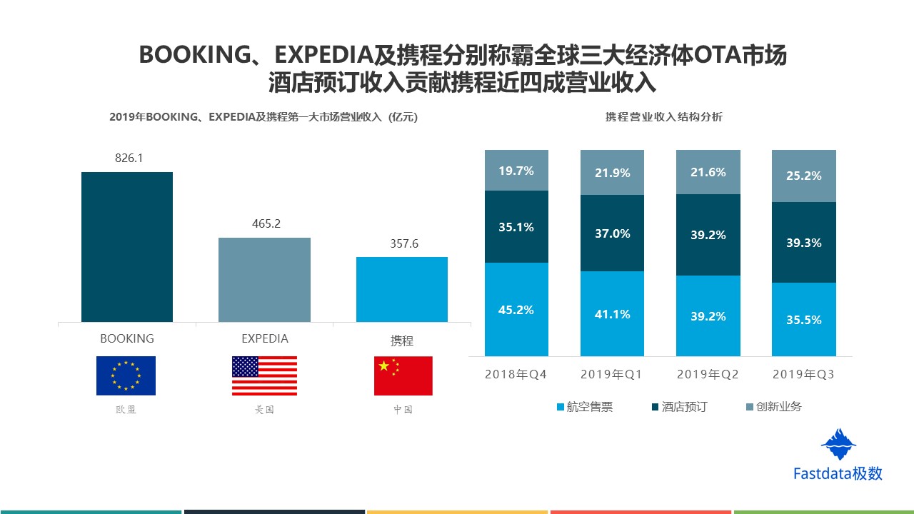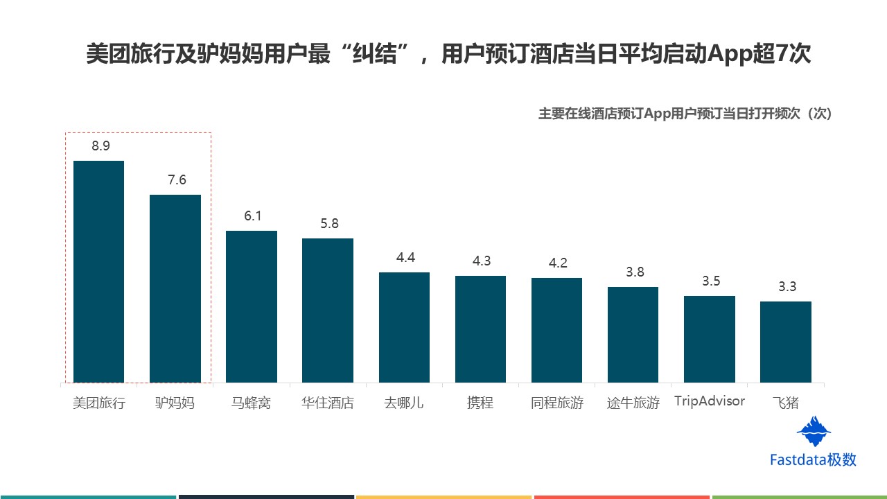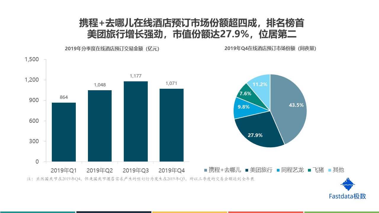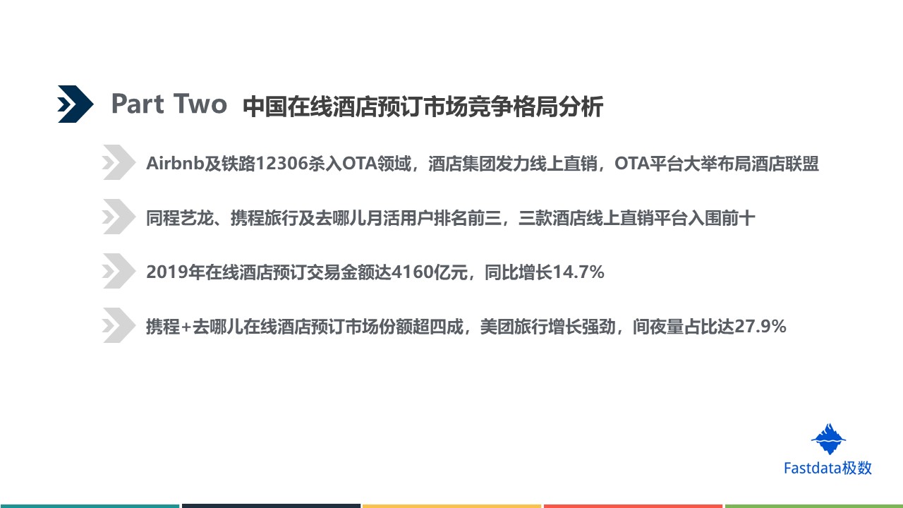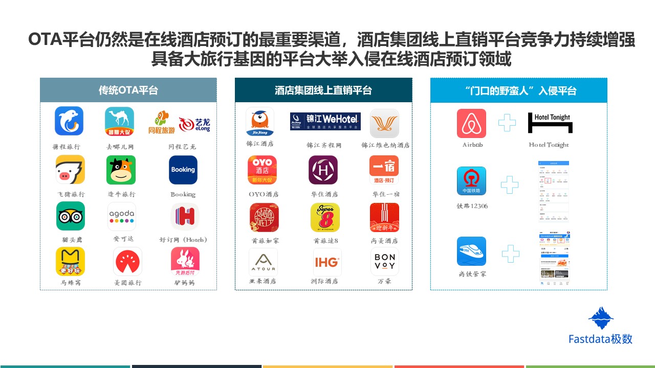 线上预订竞争更加激烈:大型连锁酒店可供出租间夜量大幅增长,为了在与OTA平台的博弈中有更多的筹码,增强分销能力,大型酒店集团大举布局线上直销,其中,华住会、OYO及首旅如家月活用户规模已经入围在线酒店预订平台前十。此外,具备大旅行基因的平台也在积极布局在线酒店预订,民宿平台Airbnb收购hotel tonight进入酒店预订行业,铁路12306提供酒店预订服务,正在全力打造旅行一站式服务平台,在线酒店预订行业的竞争压力持续增大。但目前OTA平台仍然是在线酒店预订的主要渠道,其中携程+去哪儿市场份额超四成,霸主地位稳固,美团酒旅增长强劲,市场份额增长至27.9%,排名第二。