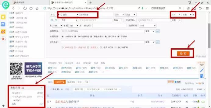 ,大家看到的这张图片是中国知网检索页面的一个截图,进到这个界面以后,我们选择检索项为“篇名”,在篇名旁边的文本框里键入我们的选题关键词,比如上面提到的“意识形态”,然后选择“精确”检索,这样我们一点“检索”按钮,就会出现和我们选题关键词精确相关的论文了,在检索页面的左下角,我们还可以发现把“意识形态”作为篇名发表那些文章的期刊里,核心期刊有多少篇,CSSCI期刊有多少篇。