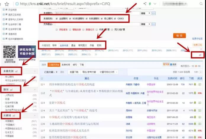大家可以看下这张截屏图片,在图片右侧中间方框之内,大家可以看到的一个趋势小图标。我不知道大家以前在用中国知网检索功能的时候,是否注意到了这个小图标?如果以前注意到了那当然更好。如果以前没有,那么从现在开始,我们应该善用这个小图标,这其实是一个“可视化”功能的按键,它会把检索结果用一个直观的趋势图来呈现。 通过这个趋势图,我们对自己所关注的选题,随着时间的推移,学界研究的趋势是个什么样的情况等问题做到一目了然,以及每年发表期刊论文的数量变化也有清晰地呈现。 除了“可视化”之外,在这张截图中我给大家标出了几个值得注意的地方,让我们一起看一下。在中间靠上的方框里,我们看到了期刊的“来源类别”。如果我们在进行期刊论文检索的时候,每一个对勾我们都把它勾选上,那检索范围就是全部期刊。如果我们想要有点针对性,比如我们只检索被SCI和EI来源期刊收录的论文,可以只勾选这两项;如果我们只检索被核心期刊和CSSCI来源期刊收录的论文,也可以只勾选这两项。 这样条件下的检索就都是比较精准的,针对发表在论文质量比较有保障的期刊上的文章了。而且这样做的又一个好处在于,我们打算投稿的目标期刊是哪个类别,就把检索条件限定在哪个类别。这样我们就很容易把握以往发表的相关学术论文,在某个类别之中发表的数量和年份等外在趋势信息了。 往下面一点的方框里,给出的是一个“分组浏览”的信息。依次是“学科”“发表年度”“基金”“研究层次”“作者”“机构”。分别点击不同的分组,就能了解到我们这篇学术论文选题的研究领域之内发表那些论文的更为详细的信息,比如那些论文多是在哪个学科范畴内发表的,哪一年发表的论文比较多,得到过哪些基金的支持,研究层次如何,作者都是谁,来自哪个机构等。显然,这些信息都会帮助我们对学界研究的现状有更富有层次的认知。 再来看一下这张截屏图片的左侧,从上到下我用方框圈出了三个内容,分别是“来源类别”“期刊”和“关键词”。这三个类别都是可以点开的,而且也有可视化的按钮。通过这几个栏目,我们就能了解选题既有学术论文的来源类别是如何的,主要发表在了哪些期刊上,以及这些论文的关键词出现的频率。如果我们能把这个检索页面提供的信息充分利用的话,其实基本就可以对自己想要作为选题来写的那篇文章的价值,有了一个初步的价值评估了。 在了解了中国知网期刊检索的一般项目之后,我们做一个实操,重点看看“可视化”按键能给我们呈现如何的内容。