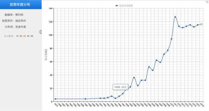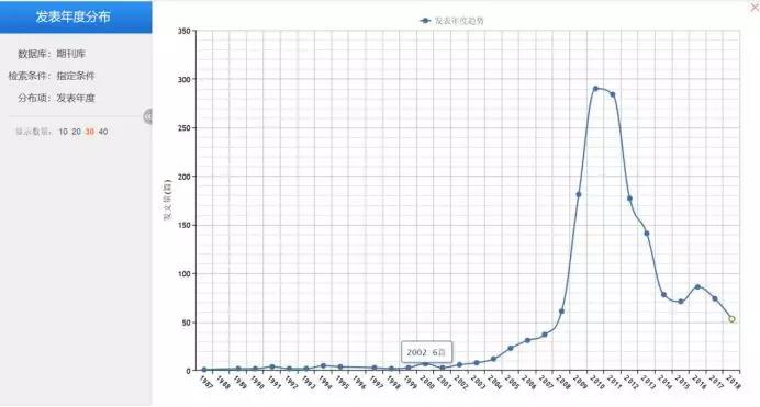 在这里,我是把“中国模式”作为关键词,然后在期刊检索中进行了精确检索。然后在检索结果页面点击了“可视化”按键,于是就呈现出这样一个趋势图。这里展示的就是随着时间的推移,我们国内学界在中国模式这个领域发表的学术期刊论文数量,我们会发现,大概是在2010年前后,有关中国模式的研究处于最高潮,研究文献的数量是最多的。然后随着时间的推移,研究热度在不断衰退。 其实这就在向我们传递着一个信息:如果我们现在也想写一篇以“中国模式”作为选题的论文,是否还有价值?我们可不可以跟进?我个人觉得跟进的难度会比较大,因为研究的高潮已经过去了,正如这张趋势图中所展示的:2010年之后,该项研究的高潮就已经开始往下退了,而且是持续走低的趋势。所以可以大致认为,如果我们现在再去跟进的话,其实是跟进一个已经“过气”了的选题。