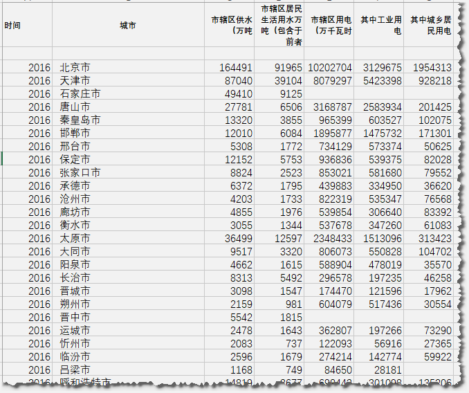 全国地级市(含直辖市)用水、用电数据:2007-2016,详细的数据维度参见下面的截图。