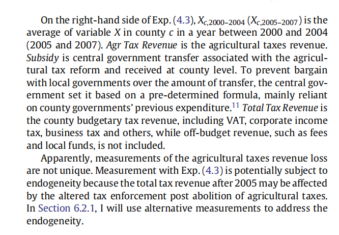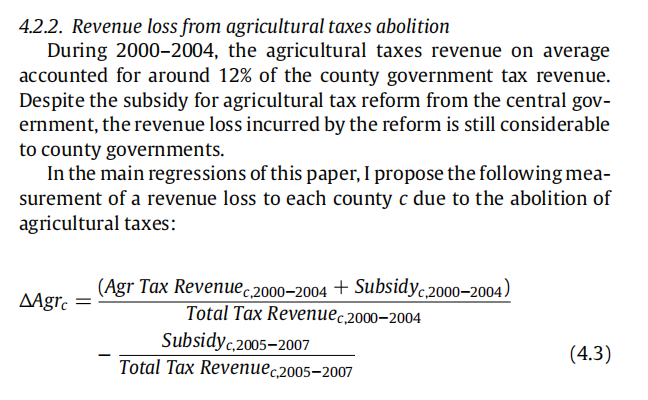 想向大家请教一个关于上次那篇文章那个农业税DID方法的处理问题。问题是这样的,The effect of a fiscal squeeze on tax enforcement: Evidence from a natural experiment in China 这篇文章里,引入了一个财政冲击的变量,它是这么定义的,,