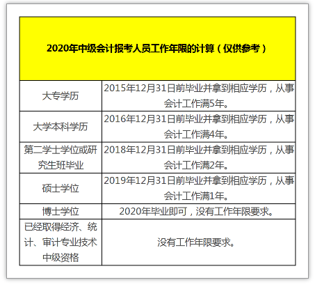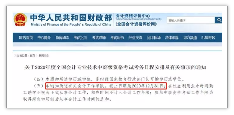 财政部官网公布的《关于2020年度全国会计专业技术中高级资格考试考务日程安排及有关事项的通知》,对工作年限认定进行了具体的阐述: