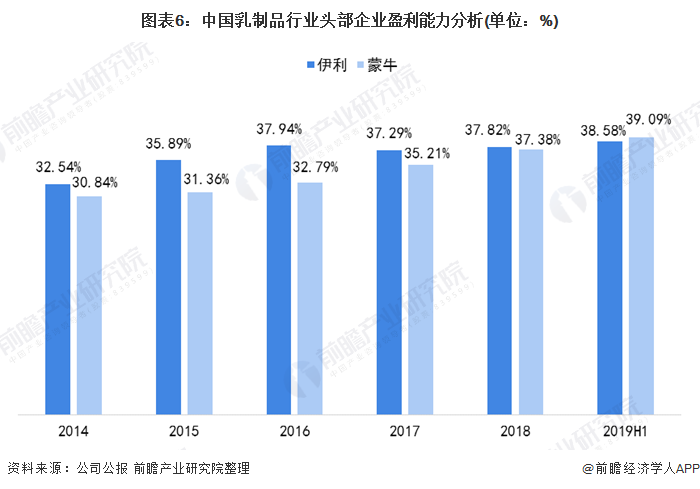 从盈利情况来看,近年来,蒙牛的盈利能力逐渐增强,2018年,蒙牛毛利率约为37.38%,伊利约为37.82%,2019年上半年,蒙牛毛利率超过伊利,为39.09%。从行业盈利能力来看,我国乳制品行业盈利能力相对较强。
