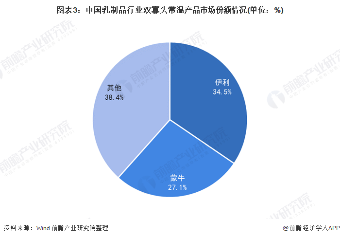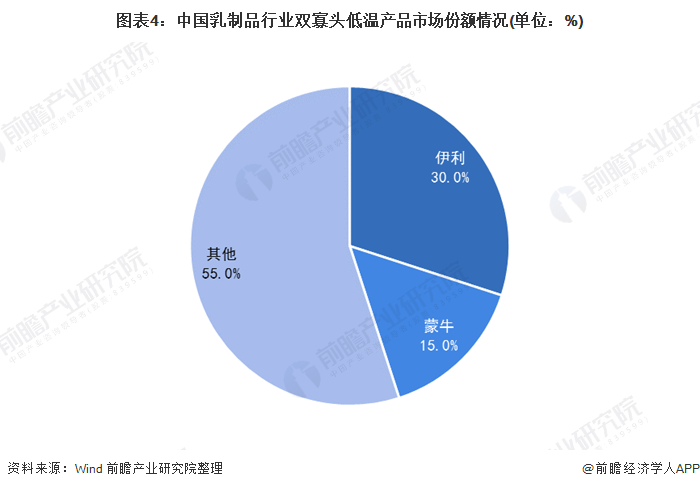 从我国乳制品市场中主要产品的市占率来看,蒙牛和伊利为我国乳制品行业的龙头企业。伊利双寡头常温产品市场占率约为34.5%,蒙牛约为27.1%;伊利双寡头低温产品市场份额约为30%,蒙牛约为15%。