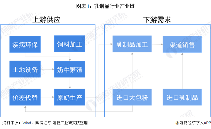 乳制品行业产业链条相对较长,上游主要包括奶牛繁殖、饲料加工、原奶生产等多个环节,下游主要为市场销售环节。