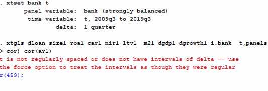 龙小猫0527 发表于 2020-3-14 12:46 数据为季度数据,存在组间异方差,组内自相关,同期相关,用了全面fgls.结果报错时间不规则?求解答,感谢