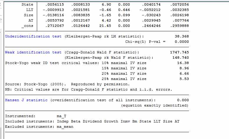 本人采用了ivreg2命令,得出了Anderson LM 和Cragg-Donald Wald F结果,可是不知道怎么看,工具变量是否选取合适{:0_288:}{:0_288:}{:0_288:}{:0_288:}求求各位伸出援手,救救孩子吧