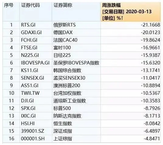 全球重要股指一周(3月9日-14日)涨跌情况汇总。