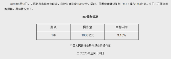 央行今日公告称,2020年3月16日,人民银行实施定向降准,释放长期资金5500亿元。同时,开展中期借贷便利(MLF)操作1000亿元,中标利率为3.15%,与上期保持一致。