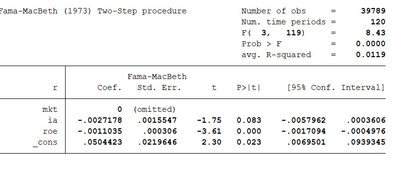 1)我本来是用stata的xtfmb指令,被解释变量re,解释变量mkt,ia,roe。是用xtfmb结果如下: