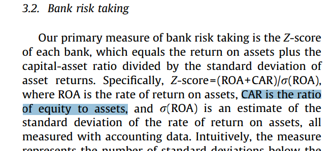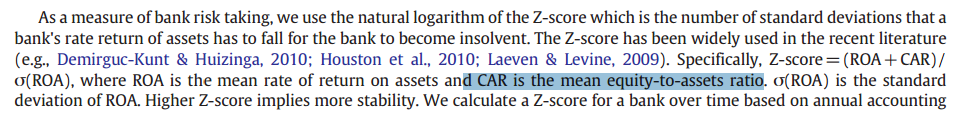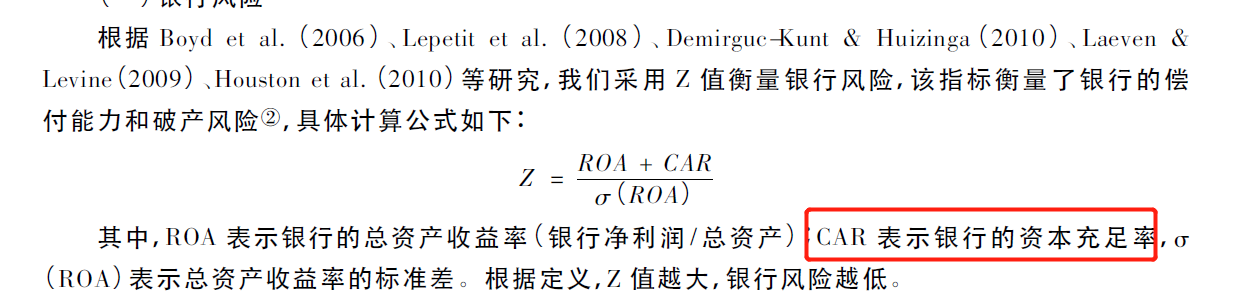 根据张、王在《经济研究》中引用的 据Boyd et al. ( 2006 ) 、Lepetit et al. ( 2008 ) 、Demirguc-Kunt & Huizinga ( 2010 ) 、Laeven &Levine( 2009) 、Houston et al. ( 2010) 等的文章中 CAR变量皆为权益资本比。