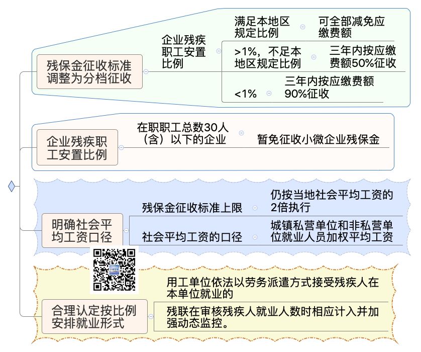 (一)实行分档征收将残保金由单一标准征收调整为档征收,自2020年1月1日起至2022年12月31日,对残疾人就业保障金实行分档减缴政策。其中:用人单位安排残疾人就业比例达到1%(含)以上,但未达到所在地省、自治区、直辖市人民政府规定比例的,按规定应缴费额的50%缴纳残疾人就业保障金;用人单位安排残疾人就业比例在1%以下的,按规定应缴费额的90%缴纳残疾人就业保障金。
