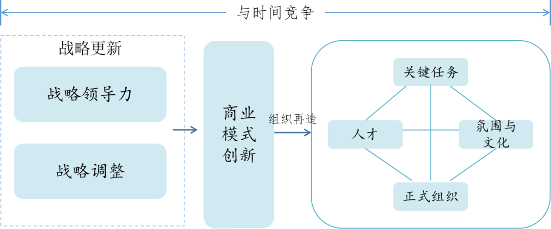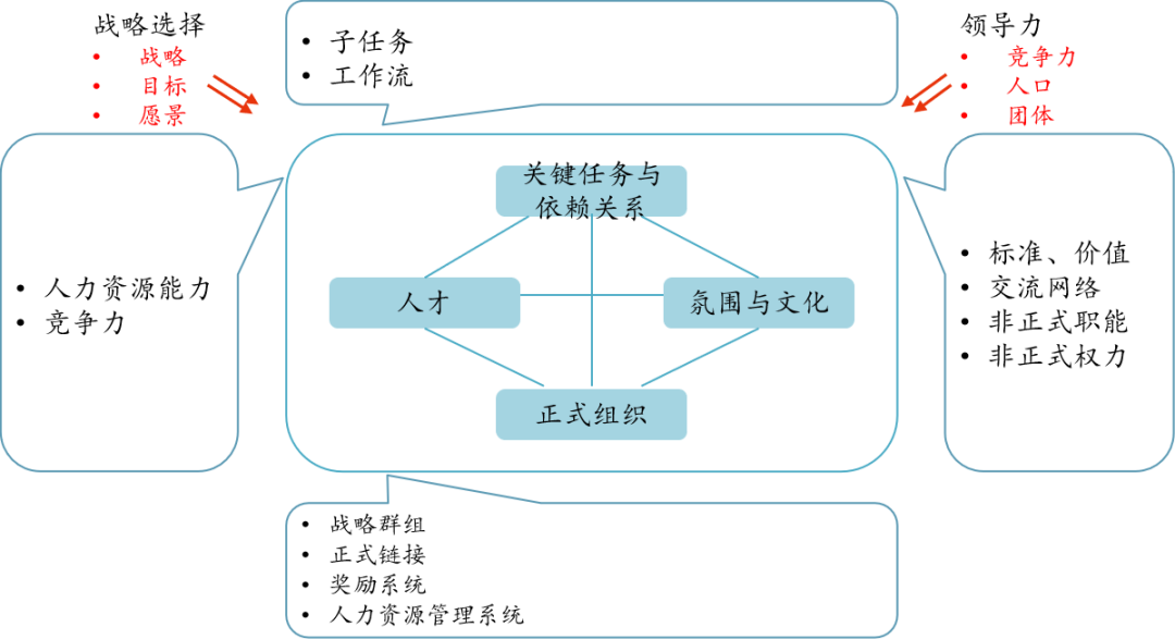 美国组织学家、哈佛大学教授塔什曼提出了“组织一致性原理”。他认为,在企业战略确定之后(包括危机之后制定的战略),组织在关键任务、正式组织、人才、氛围与文化上必须保持“一致”(图1)。