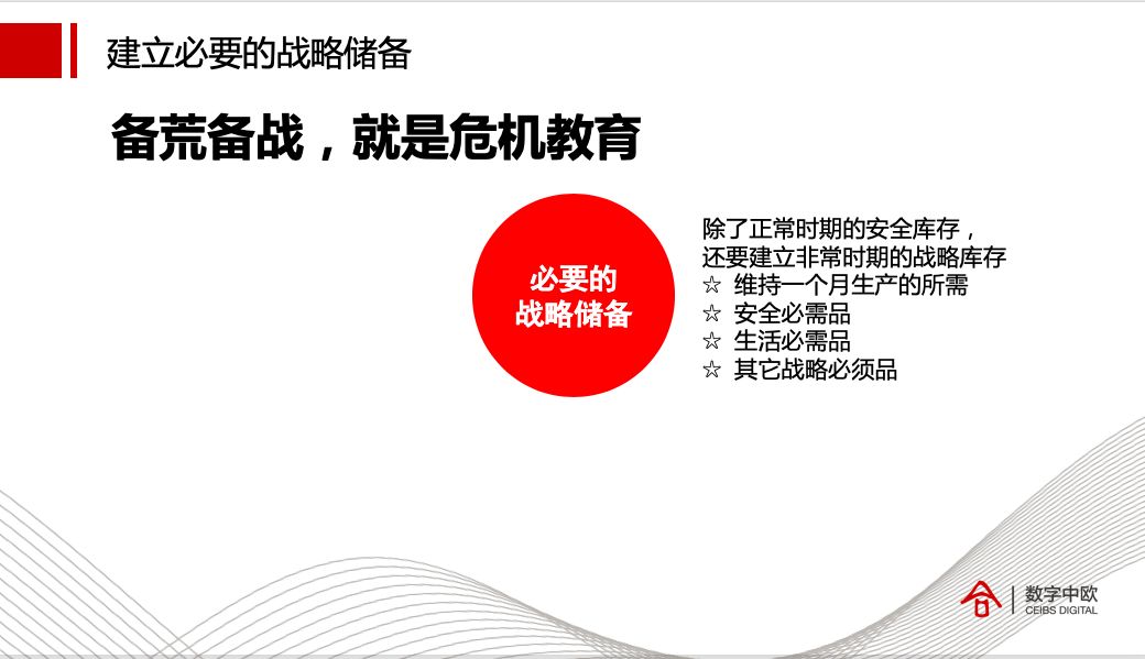 风险管理还有一个重要的方面,就是确保必要的战略储备。除了正常时期的安全库存,企业还要建立非常时期的战略库存,比如:维持一个月生产所需的战略物料、安全必需品、生活必需品等。