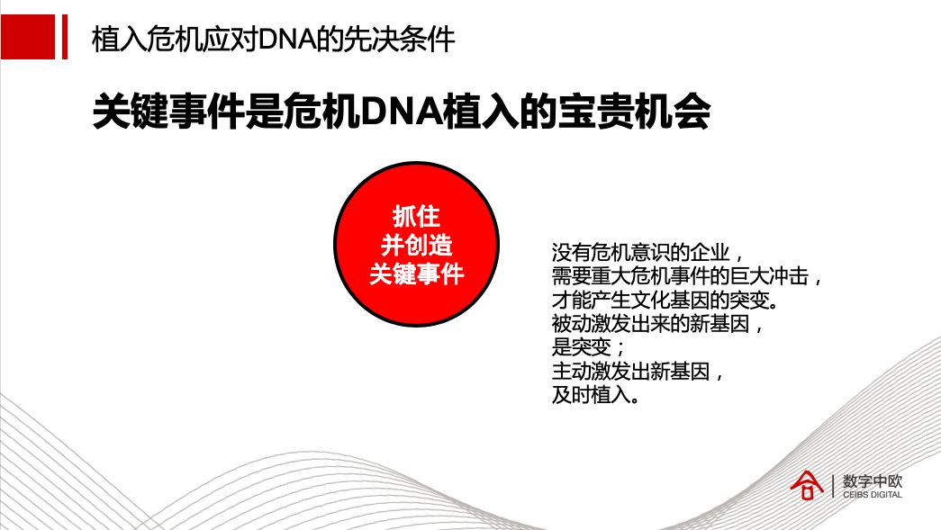 关键事件是植入危机应对DNA的先决条件。没有危机意识的企业,需要重大危机事件的巨大冲击,才能产生文化基因的突变。被动激发出来的新基因,是突变;主动激发出来的新基因,就是植入。