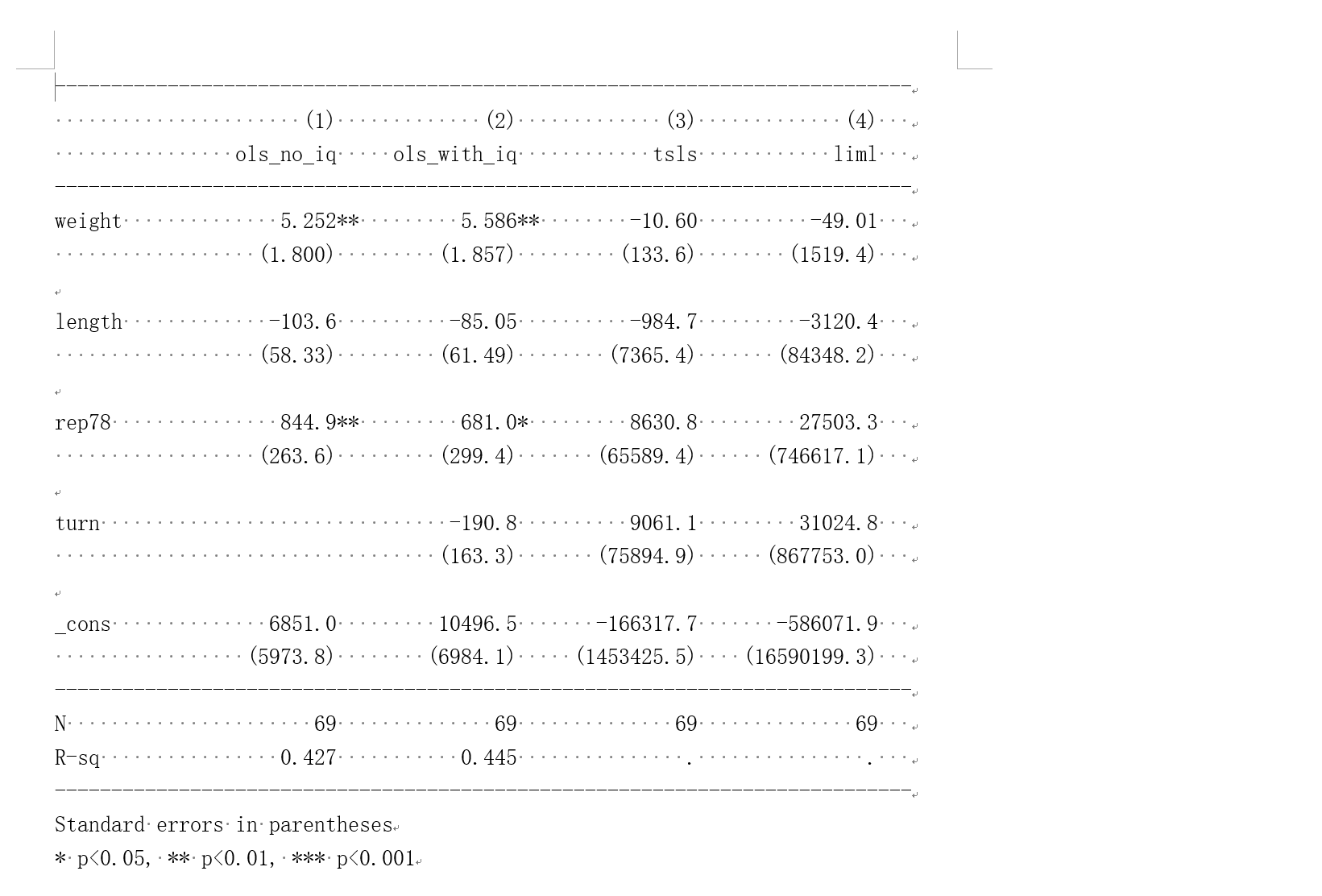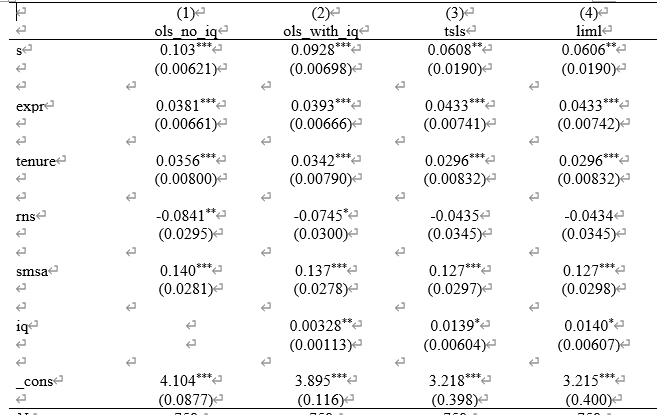 esttab ols_no_iq ols_with_iq tsls liml using "C:\Users\admin\Desktop\1.rtf",se r2 mtitle