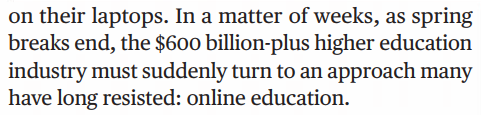 在他们的笔记本电脑上。几周后,随着春假的结束,价值6000多亿美元的高等教育行业必须突然转向一种许多人长期抵制的方式:在线教育。
