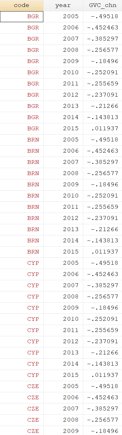 之后将被解释变量换成了中国GVCposition的绝对指标(也就是说对于每一个国家的被解释变量在数值上都一致,都是中国的GVC指数,这个数据每11行重复一次)。