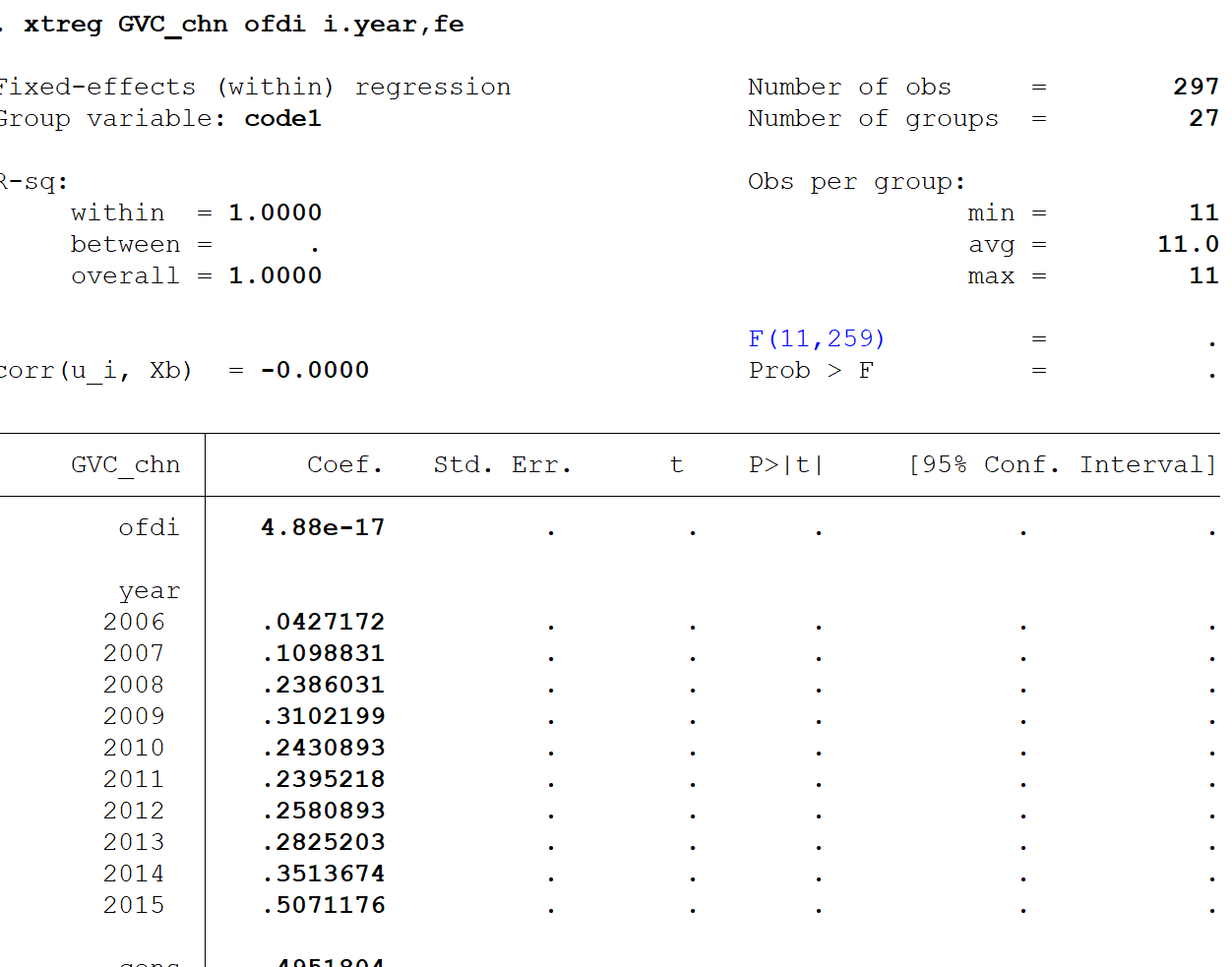 然后我使用了xtreg i.year,fe进行了回归,结果发现回归结果全是点点,检查了不存在共线性。
