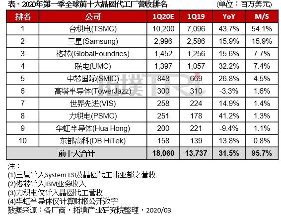 根据集邦咨询旗下拓墣产业研究院分析,2020年第一季晶圆代工产业延续上一季的订单挹注与库存回补,预估总产值仅较前一季衰退2%,年度表现受惠2019年同期基期较低,年成长近30%。不过在新冠肺炎冲击全球市场导致经济动能趋缓的情况下,需求端存在极大的变量,恐将弱化接下来的成长力道。