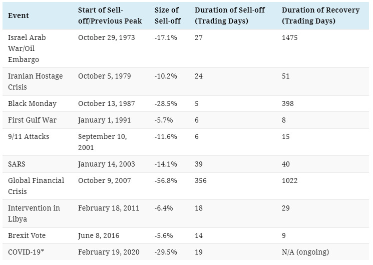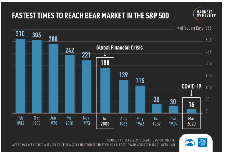 COVID-19: How Long Will it Last?[size=1.1]It’s difficult to predict how long COVID-19 will impact markets, as its societal and financial disruption is unprecedented. In fact, the S&P 500 reached a bear market in just 16 days, the fastest time period on record.