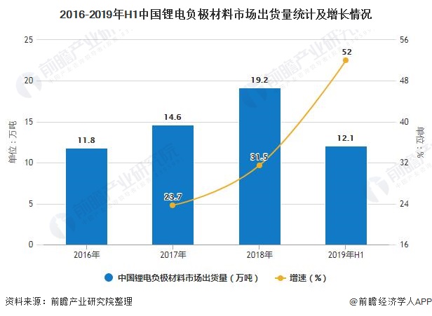 受2018年中国动力电池出货量同比增长46%的拉动,2018年中国锂电池负极材料市场出货量19.2万吨,增幅31.5%。2019年上半年,中国锂电负极材料市场出货量达到12.1万吨,同比增长52%。