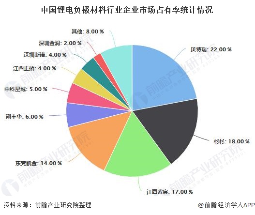 中国锂电负极材料行业市场集中度较高,根据高工产研锂电研究所(GGII)数据,2018年贝特瑞、杉杉、江西紫宸、东莞凯金、翔丰华、中科星城、江西正拓、深圳斯诺、深圳金润、长沙格翎等负极材料企业出货量进入前十。其中贝特瑞、杉杉、江西紫宸市场占有率分别为22%、18%、17%。