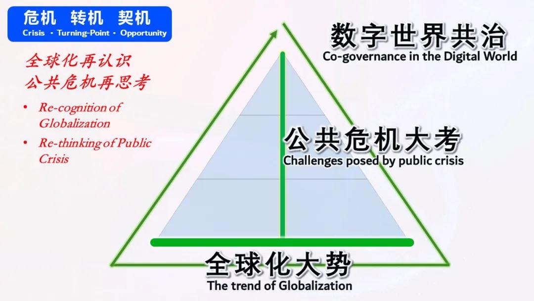 三、怎么看数字世界共治整体来看,全球化大势和公共危机大考都在呼唤数字世界共治。这一横一竖正好支撑了数字世界共治的金字塔模型。这个三角型架构呈现了数字世界共治的新思路新要素。换句话说,数字世界的共治,涵盖了全球化的升级版,需要在经济、政治、文化,三个视角、三个维度来统筹推进,以人类文明的交流互鉴,即文化的全球化,来沟通弥合经济全球化与政治多极化之间的分歧,既要求同化异,也能求同存异,通过多元文化的理解接纳,共同打造全球化的升级版,为全球化开辟新的成长空间。发言最后,我想引用哈佛大学校长劳伦斯.巴考上周讲的一段讲话,他说“没人能预知在后面几个星期即将面临我们的是什么,但是我们每个人都要懂得COVID-19将考验我们在危急时刻所显示的超脱于自我的善良和慷慨。我们的任务是在这个非我所愿的复杂混沌的时刻,展示自己最好的品格和行为。愿我们与智慧和风度同行。”