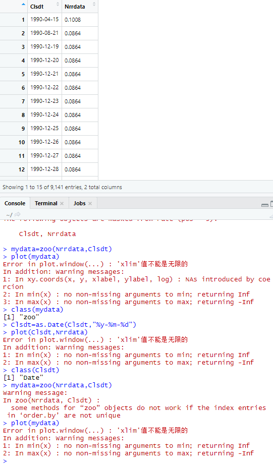 从Excel里上传数据,并将其转换成zoo格式,使用plot()函数作图,出现问题:“xlim值不能是无限的”
