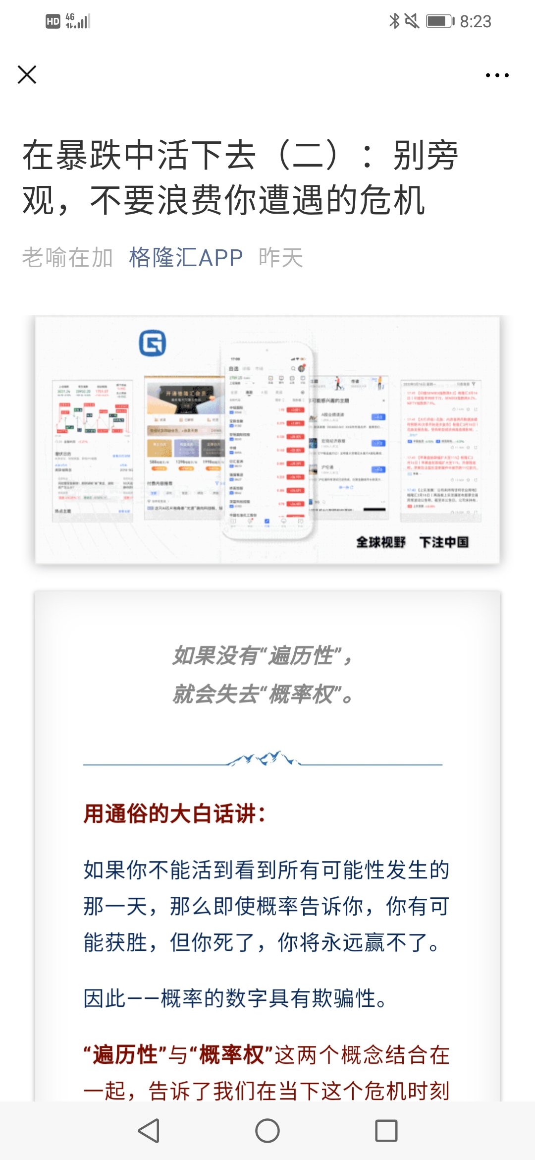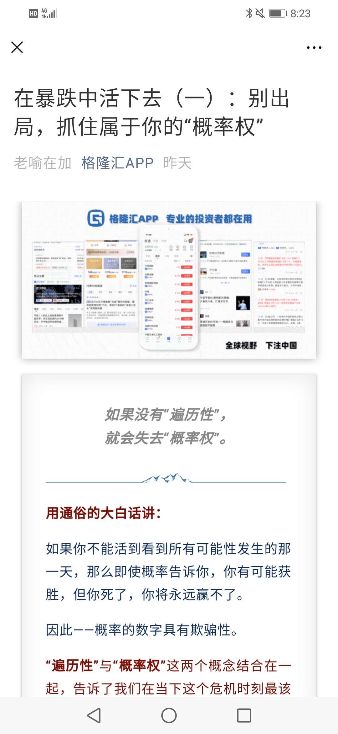 很玄乎的文章,竟然看进去了。简而言之就是:在证券市场要成功,就1.不要赌博心态,2.不要恐惧进场。不要赌博,不要把所有资源都all in到高回报行当,即使是你熟悉的行业,因为市场存在小概率事件,只要你活的足够久,你就会遇到,all in可能会让你损失所有的筹码,这就是我理解的“历遍性”。不要恐惧进场,对失败的恐惧你不近场,其实就是隐性出场,只能看着牛市一过再过,就是“概率权”。要求还是巴菲特那句话,要保本。但要留出比例给高收益项目。但我觉得关键还是你得对这个行当有足够知识,不然一切都是扯,证券市场我们真的下到功夫了,再谈这些。现在对于我这种弱鸡,用极少钱试试水,赶紧完善知识是关键。