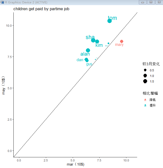 labs(title="children get paid by partime job",x="mar(10$)", y = "may(10$)")+