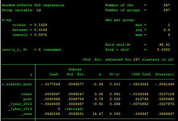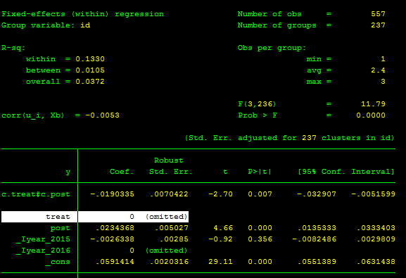 PS:作为问题的补充,我尝试把命令中的fe去掉,即用xi:xtreg y c.treat#c.post treat post i.year, vce(cluster id) 来进行回归,如图2所示,treat已经有数据了。但是我认为这个命令是不对的(希望不会误导到您)。