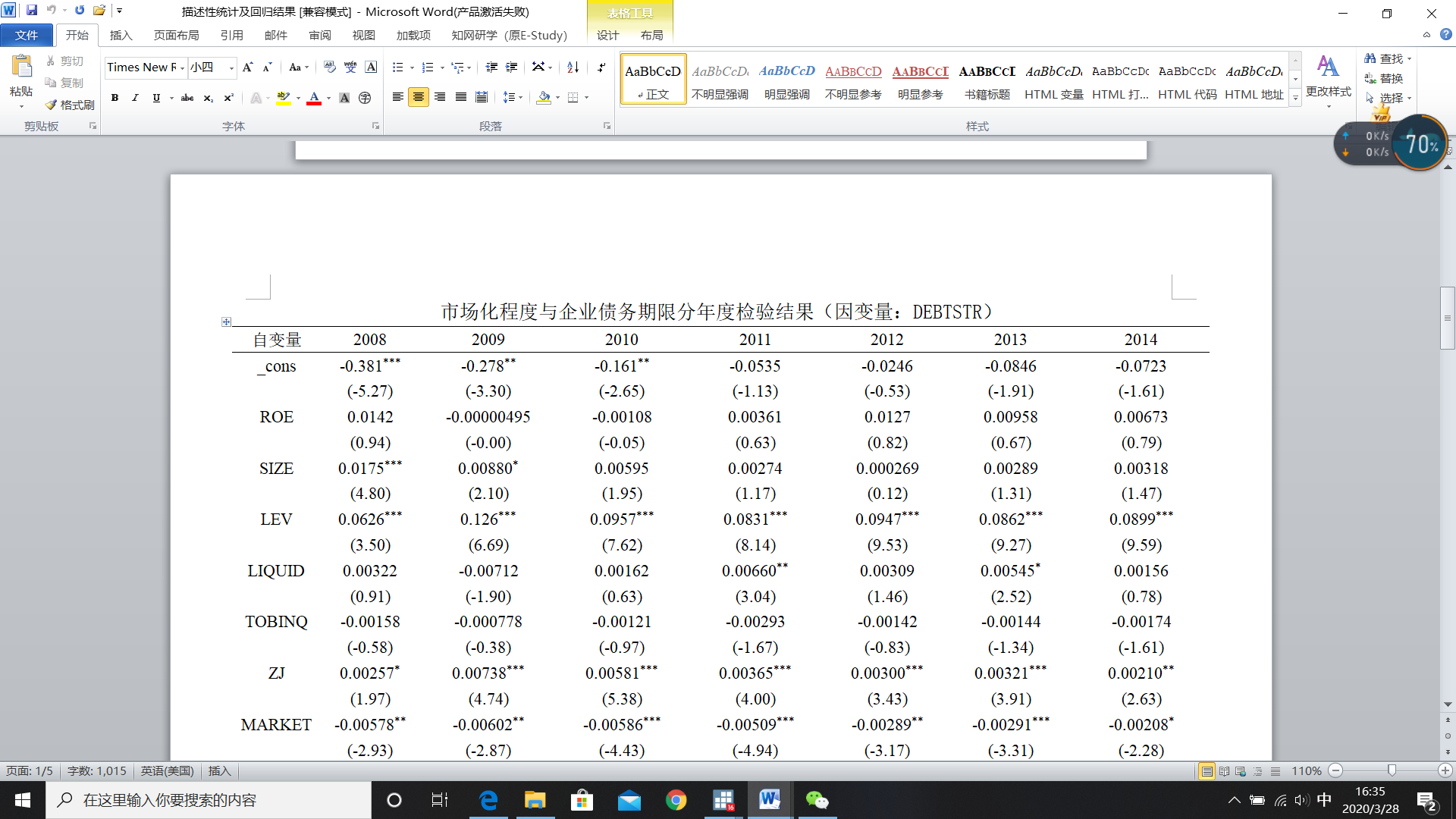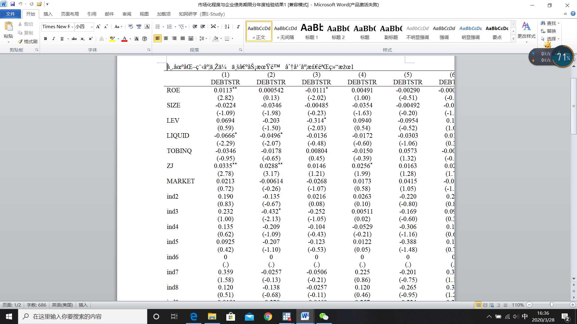 使用esttab输出回归结果,分成了两页,怎么设置页面变宽显示在一页word上?