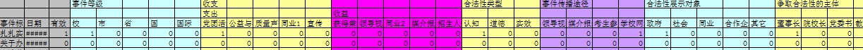 是对某单位合法性策略的探讨,数据来源于其网站的每一条新闻,共有三千多条。然后结构化数据,六个大类,若干小类。事件等级是对事件的加权,如1次省级事件算4次。