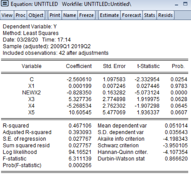 Y=0.000199X1-0.828350NEW X2+5.327736X3-5.268534X4+10.60545X5-2.560610