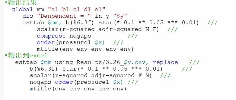 各位大神求帮忙,我这个命令写的有啥问题吗,我写的命令如第一个图片,输出的excel为Results/3.26。但stata报错了咋回事?我想要如最后一张图样式的输出结果,stata小白求帮忙!!