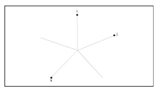 考虑一个产品类别,在该类别中,消费者具有不同的口味并在该类别中寻求N个品种的产品。其中,市场中有n家公司,每家公司只提供一种品种的产品,其中2<n<N。其中,企业j∈{1,2,…,n}位于辐条市场的末端。消费者单位需求对于产品的评价为v。消费者的总量标准化为1,并均匀分布。每一根辐条的长度标准化为1/2,位于辐条l