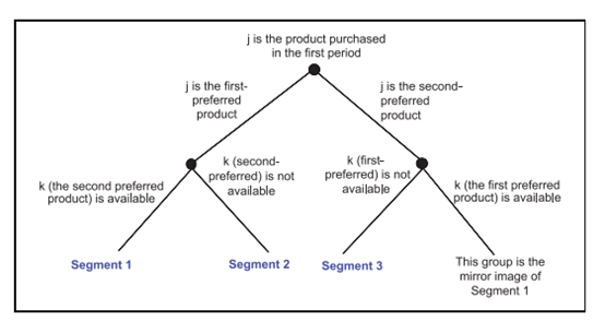 因为消费者的品味是多样化的且考虑集是有限的,辐条模型内生地产生了三部分消费者。对于竞争的细分市场中的消费者来说,在他们考虑集中的两种产品都是可获得的(细分市场1)。对于一个垄断市场的消费者来说,只有他们的首选产品是可获得的,第二偏好产品是不可获得的(细分市场2),而对于另一个垄断市场的消费者来说,只有他们的第二偏好产品是可获得的,首选产品是不可获得的(细分市场3)。具体如图2所示。