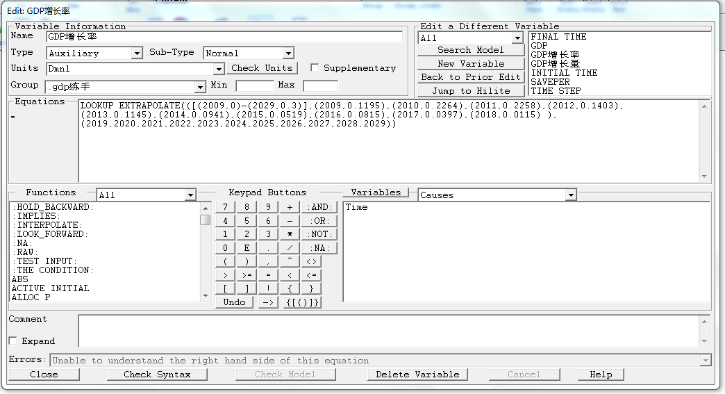 我想建立一个关于GDP的模型,↓。时间为2009-2029,只知道2009-2018年的GDP增长率,想要预测2019-2029年的增长率,是不是应该用lookupextrapolation呀?