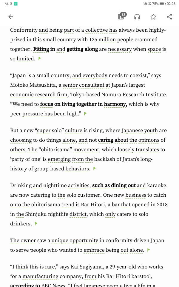 但是一种新的“超级孤独”文化正在出现,日本青年人正选择独自做事,并且不在意他人的看法。ohitorisama运动,粗略地可以翻译成“一个人的派对”,这个运动正从人们强烈抵制日本历史悠久的群体性行为当中开展起来。