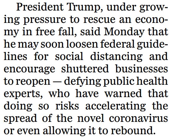 特朗普总统周一表示,他可能很快就会放松联邦政府对社会疏离的指导方针,并鼓励那些已经倒闭的企业无视公共卫生专家的警告,这样做有加速的危险新型冠状病毒的传播甚至使其反弹。