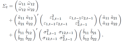 ElviraTeng 发表于 2020-5-13 16:51 你好,我想问一下bekk garch的A,B矩阵,也就是arch项系数和garch项系数需要满足和大于1吗?
