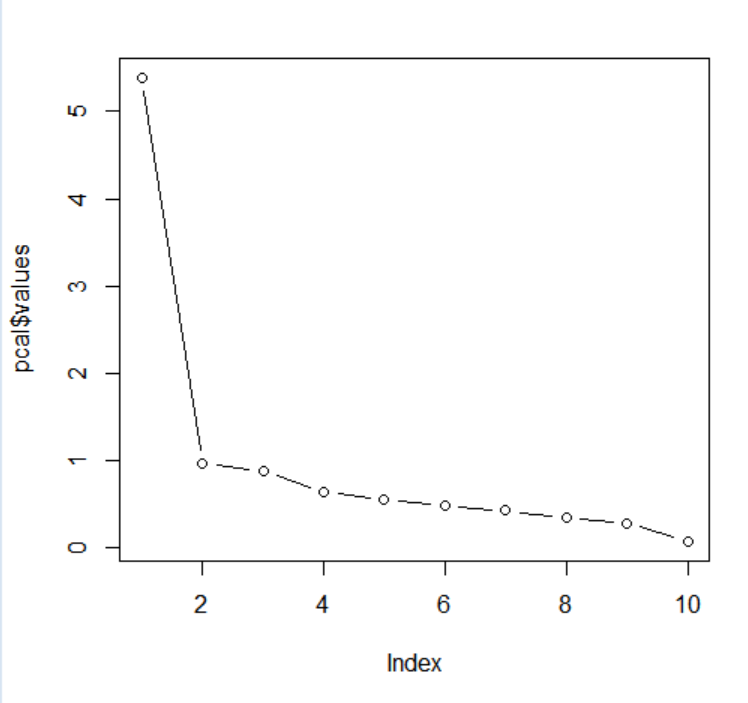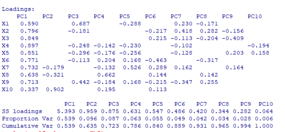 用R进行主成分分析得到了图表,但是对其中存在疑惑。1、表格中累计贡献率到PC5才勉强85%,但图又显示只有两个主成分因子,这算是矛盾吗?应该遵循哪一个? 2、分析出主成分因子后接下来还需要进行回归,这就需要把因子作为新变量引入,请问R代码应该如何操作?(或者说从图中能不能看出来因子F=B1x1+B2x2……之类的)
