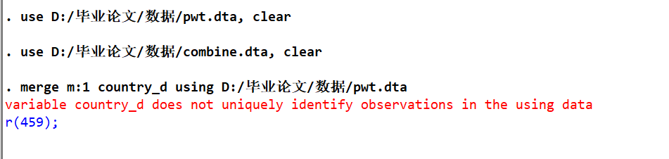 但是combine文件里country_d变量的数据是唯一没有重复的,一开始我以为是因为combine这个变量里有一些空白值会算做重复,但是我删掉空白的数据之后依然显示是这个错误,想请教下大家是为什么,应该如何解决