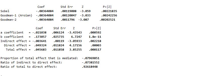 帮忙解释一下,我用 stata进行Sobel中介检验,P值显著,但是为什么最后Proportion of total effect that is mediated: 为-.07969851,即中介效应占总效应的比值为负数?符号代表了什么意思?