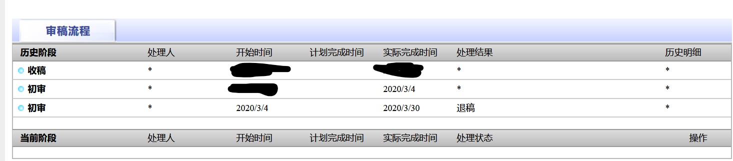 jiuxun 发表于 2020-4-2 06:12 我之前投稿时仅有一次初审,大概是如下的进程,现在还未结束,仅供参考